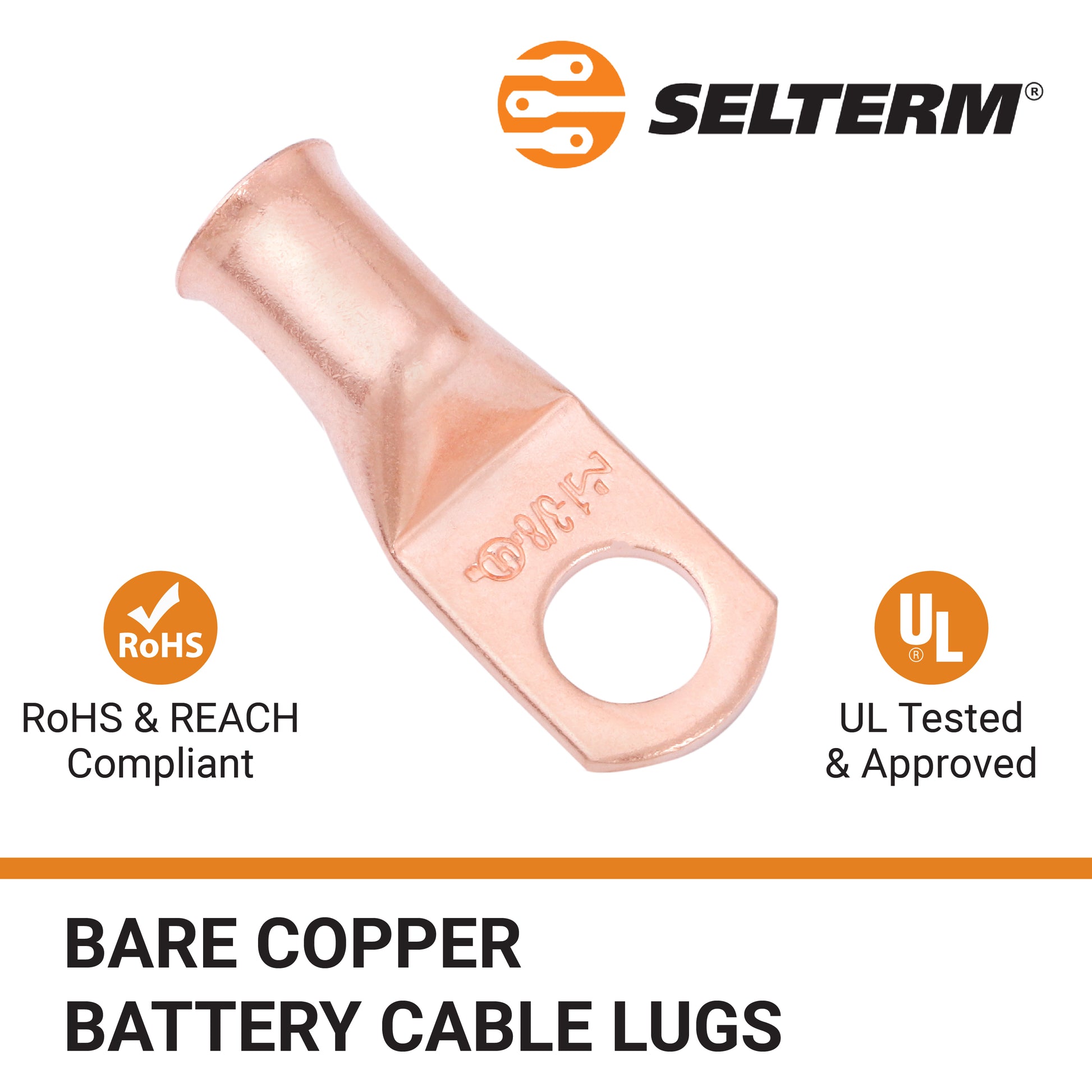 SELTERM Bare Copper Wire Lugs are made from 99.9% pure annealed copper, providing a high degree of conductivity for maximum current flow. This particular variant is suitable for use with 1 Gauge Battery Cable & 3/8" (M10) Stud.