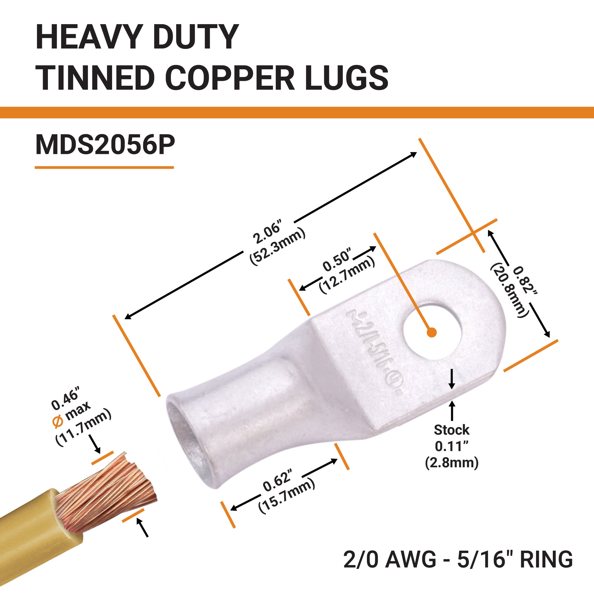 2/0 AWG (00 Gauge) 5/16" Stud, Tinned Copper Battery Cable Ends, Wire Lugs, Marine Grade, MD2056P