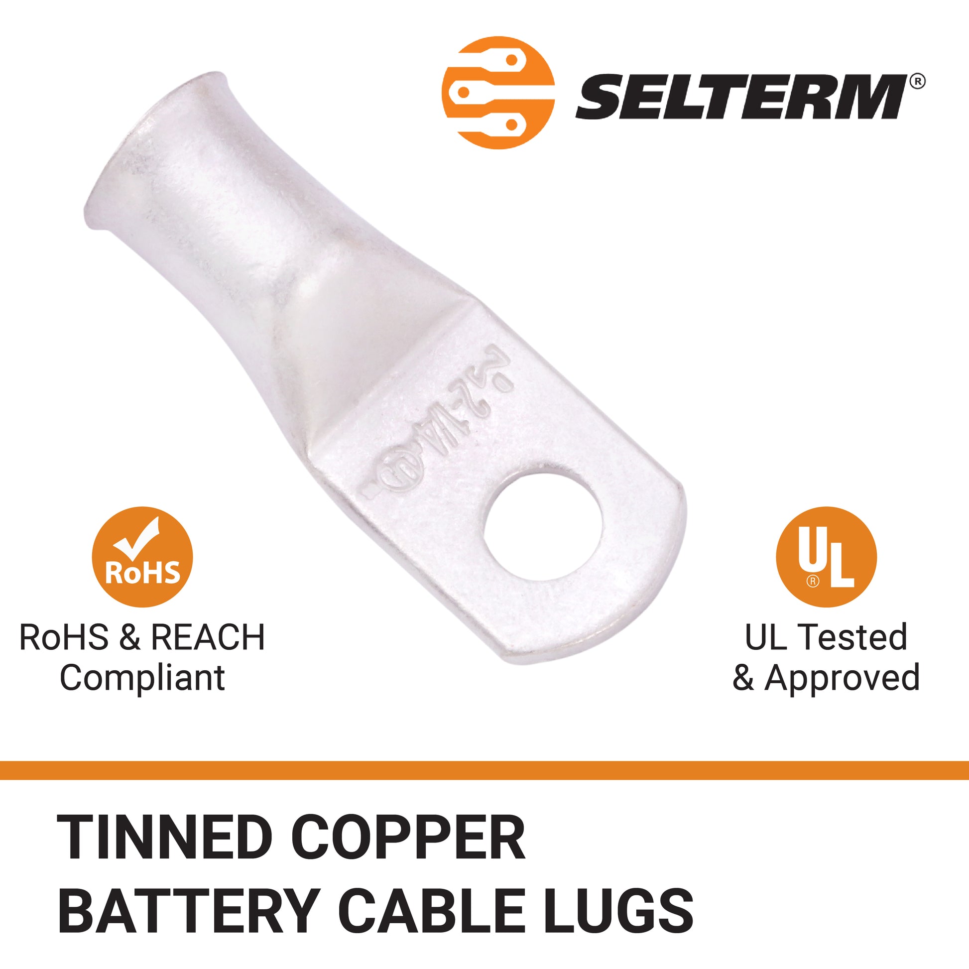SELTERM Marine Grade Wire Lugs are made from 99.9% pure annealed tinned copper, providing a high degree of conductivity for maximum current flow. This particular variant is generally suitable for use with 2 Gauge Battery Cable & 1/4" (M6) Stud.