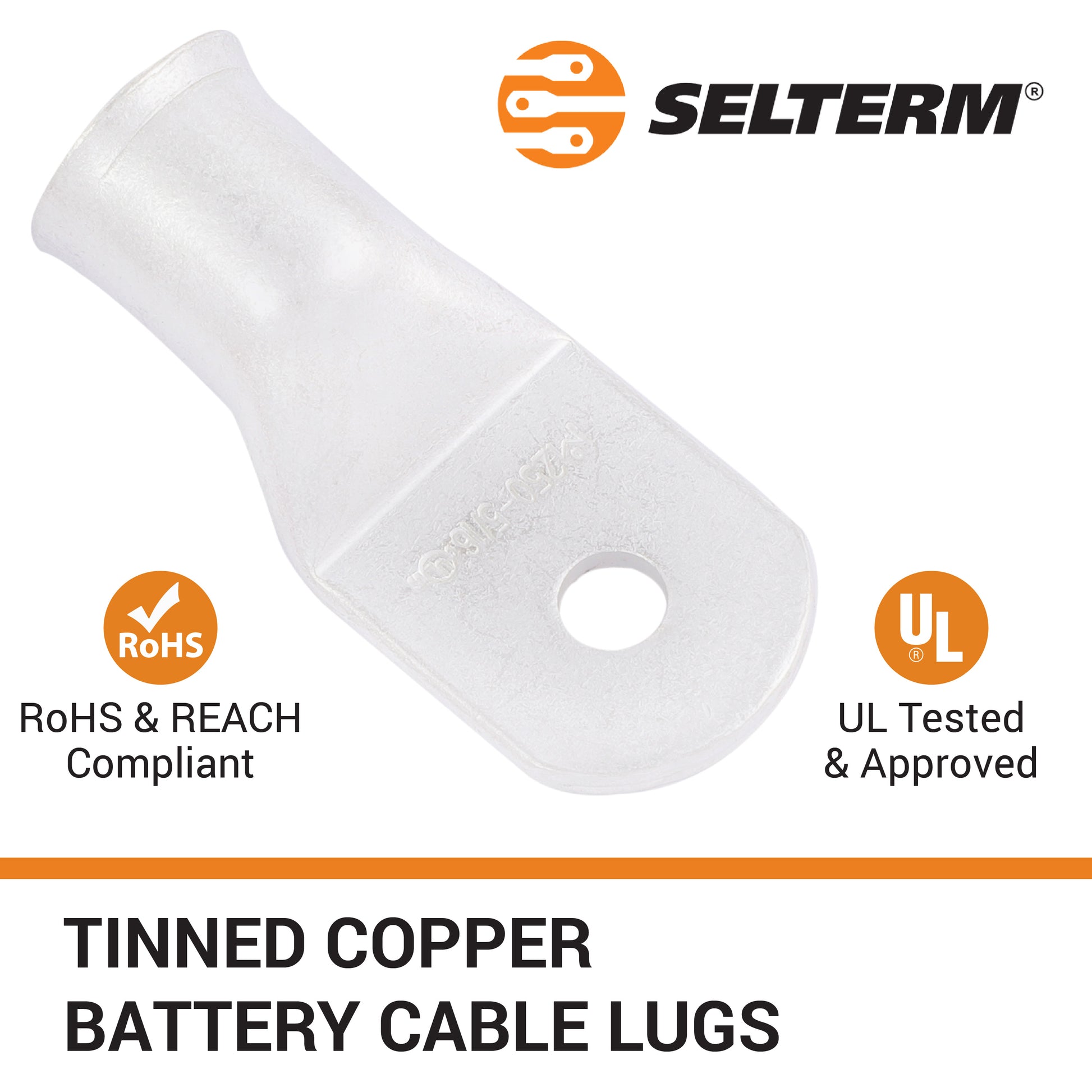 SELTERM Marine Grade Wire Lugs are made from 99.9% pure annealed tinned copper, providing a high degree of conductivity for maximum current flow. This particular variant is generally suitable for use with 250 MCM Battery Cable & 5/16" (M8) Stud.