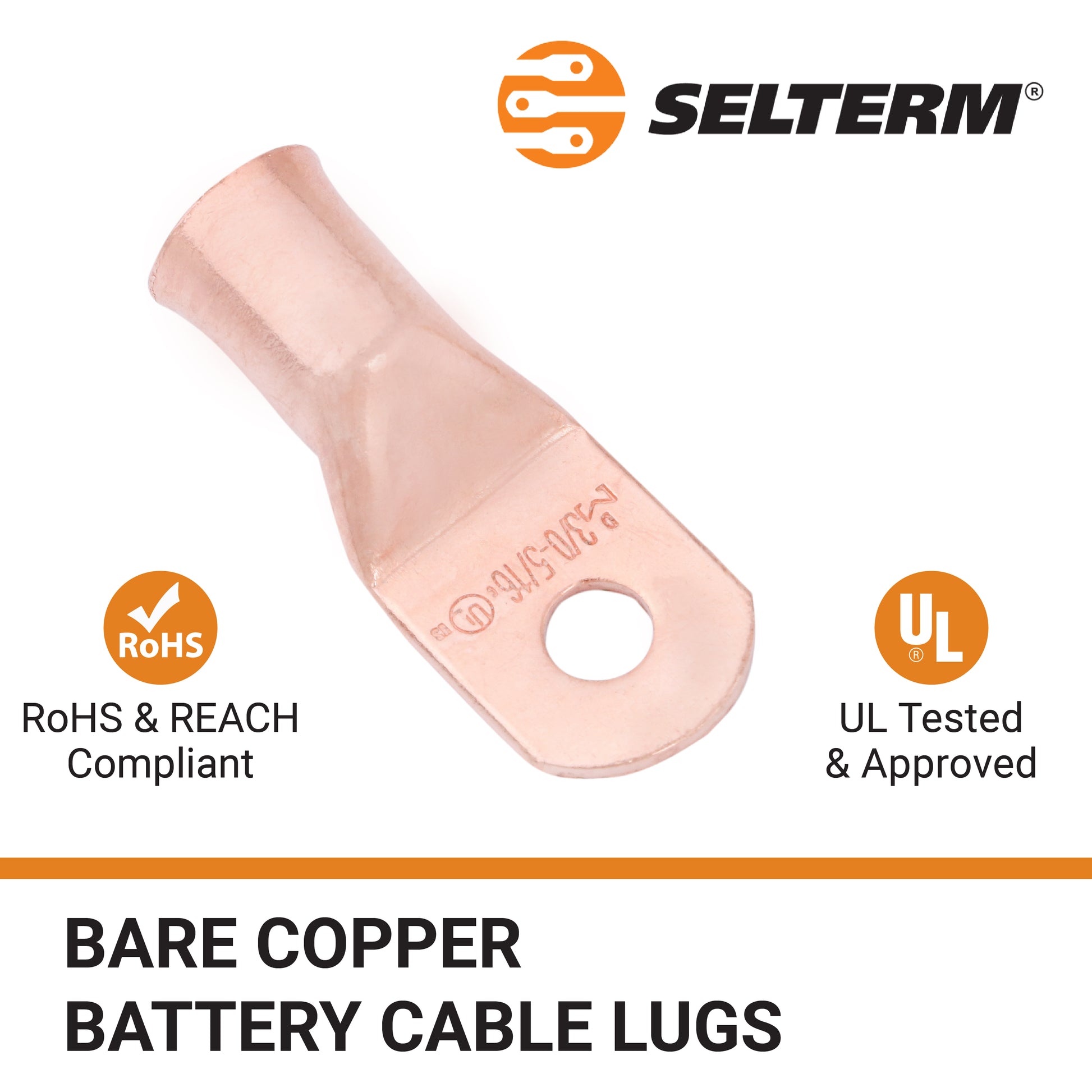 SELTERM Bare Copper Wire Lugs are made from 99.9% pure annealed copper, providing a high degree of conductivity for maximum current flow. This particular variant is suitable for use with 3/0 or 000 Gauge Battery Cable & 5/16" (M8) Stud.