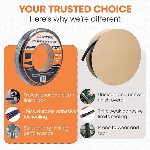 Protect and insulate your wires, connections, terminals, and splices with Selterm Heat Shrink Tubing Roll. This versatile product is perfect for long-lasting protection for bundling and protecting loose items. Also, this assorted dual wall heat shrink tube solves the problem of providing reliable and long-lasting protection for electrical connections or components from various environmental factors such as moisture, corrosion, abrasion, and physical damage and prevents electrical shock and fire hazards.
