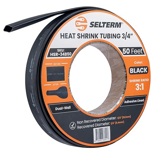 SELTERM 3/4" Black [50 Feet] Marine Grade Heat Shrink Tubing Roll, 3:1 Ratio Dual Wall Adhesive Lined Waterproof Heat Shrink Wrap Tube, for Battery Cable Lugs Wire Terminals Connectors