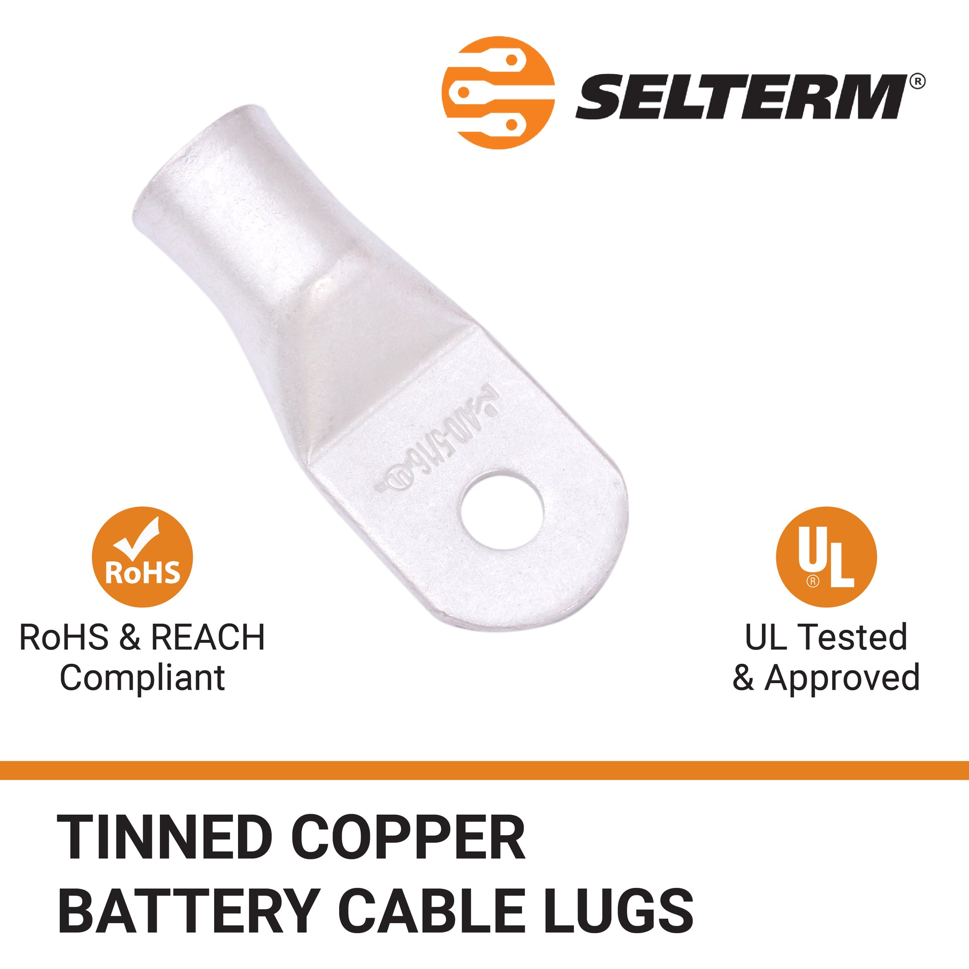 SELTERM Marine Grade Wire Lugs are made from 99.9% pure annealed tinned copper, providing a high degree of conductivity for maximum current flow. This particular variant is generally suitable for use with 4/0 or 0000 Gauge Battery Cable & 5/16" (M8) Stud.