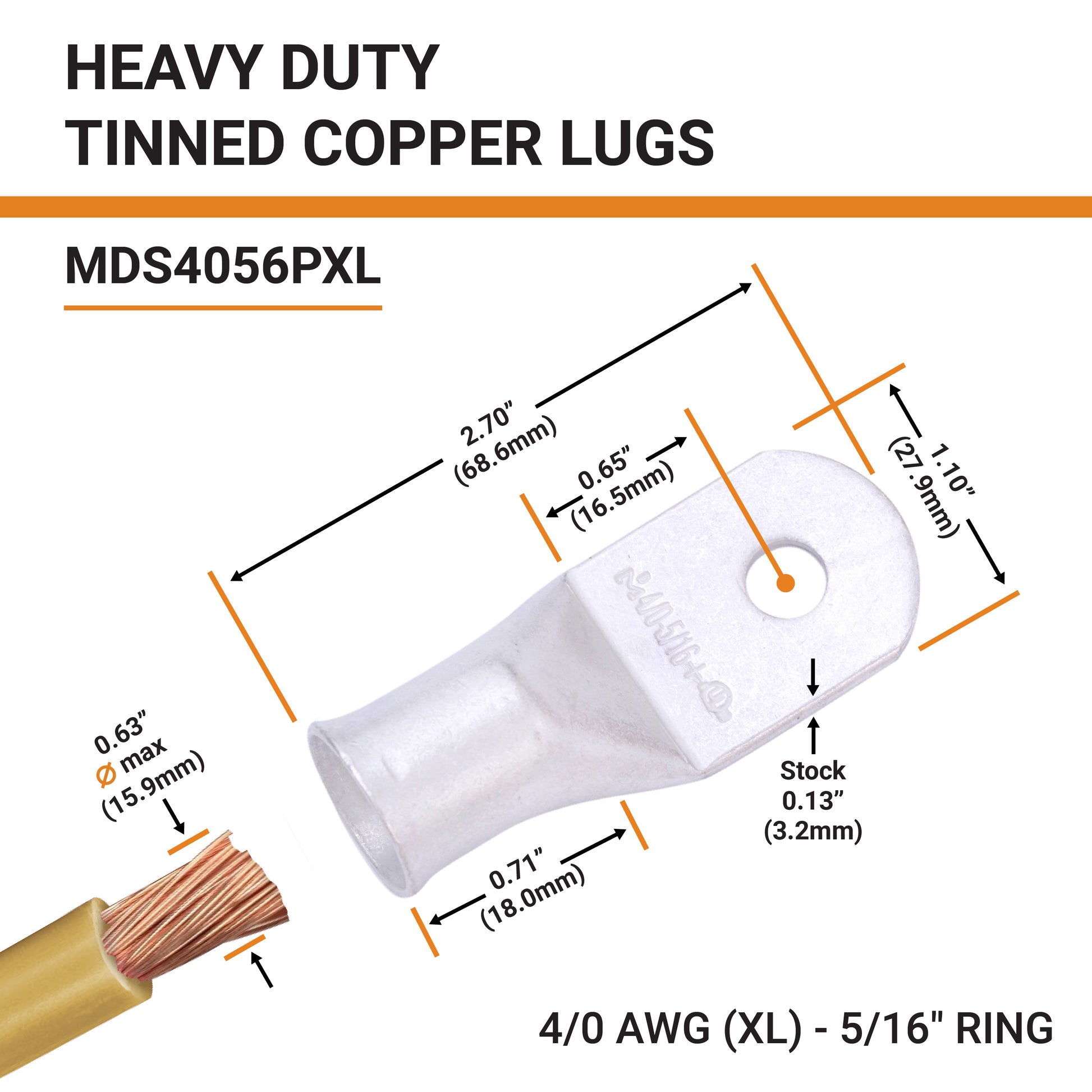 4/0 AWG (0000 Gauge) (XL), 5/16" Stud, Tinned Copper Battery Cable Ends, Wire Lugs, Marine Grade, MD4056PXL