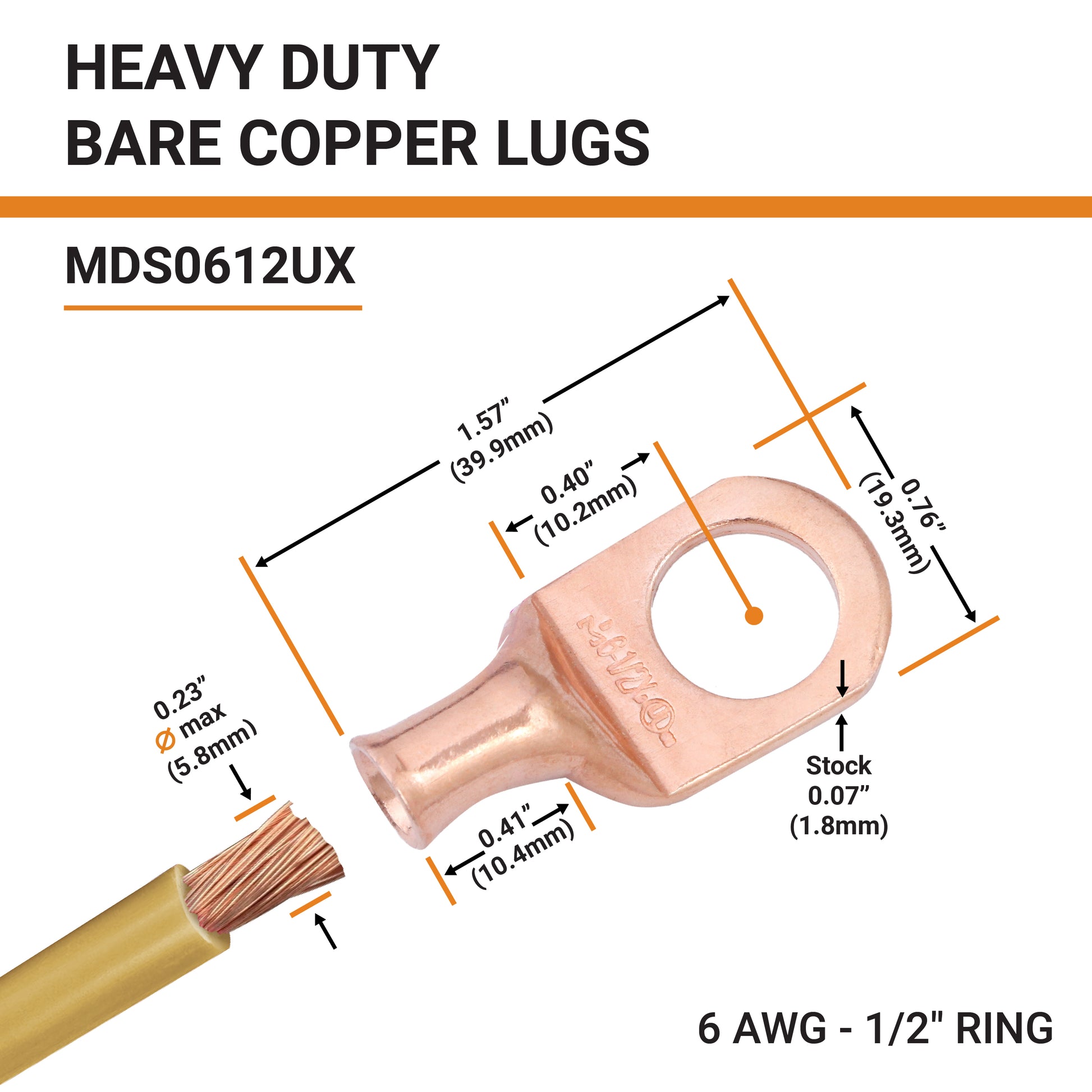 6 AWG (6 Gauge) 1/2" Stud, Bare Copper Battery Cable Ends, Wire Lugs, Heavy Duty, MD0612UX