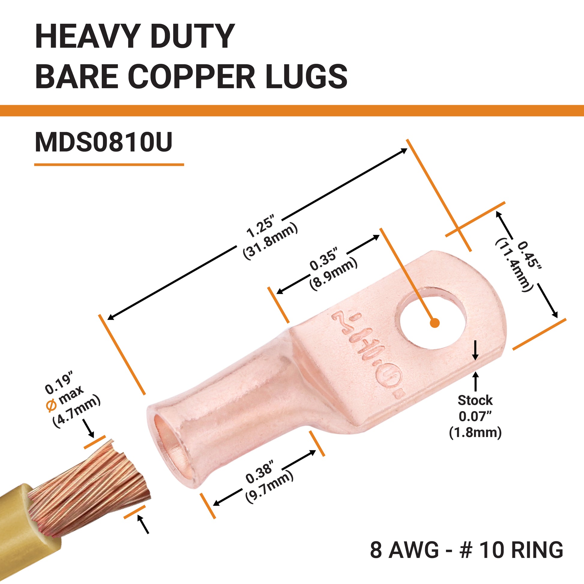 8 AWG (8 Gauge) #10 Stud, Wire Lugs, Bare Copper, Battery Cable Ends, Heavy Duty, MD0810U